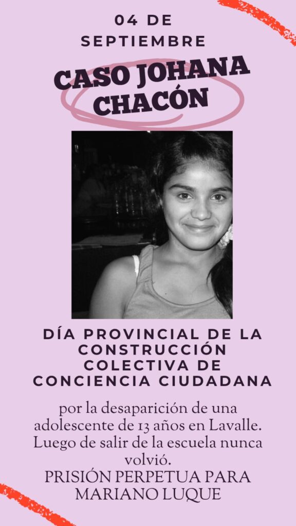 El 4 de septiembre de 2012 desapareció en Lavalle, Mendoza, Johana Chacón, una adolescente de 13 años que volvía de la escuela. Durante años no hubo respuestas claras, hasta que en 2016 su hermana Rosario declaró que había visto cómo Mariano Luque la asesinó y ocultó su cuerpo.